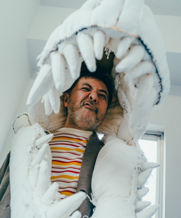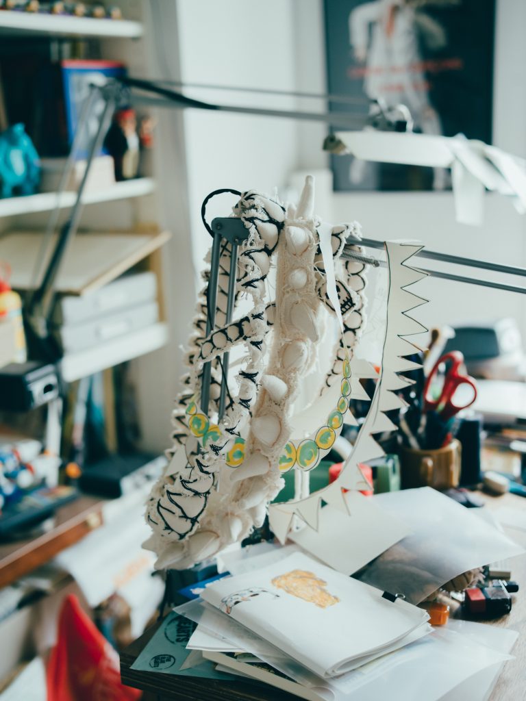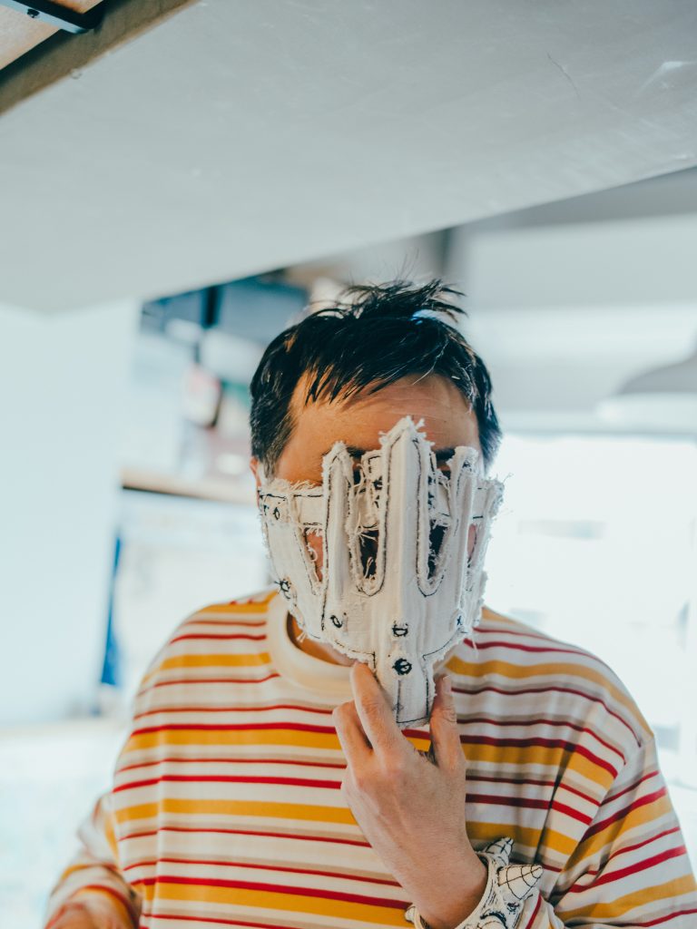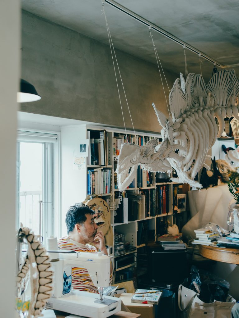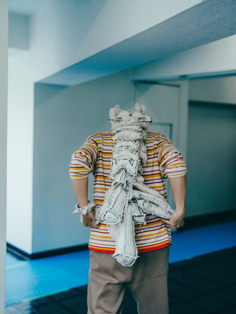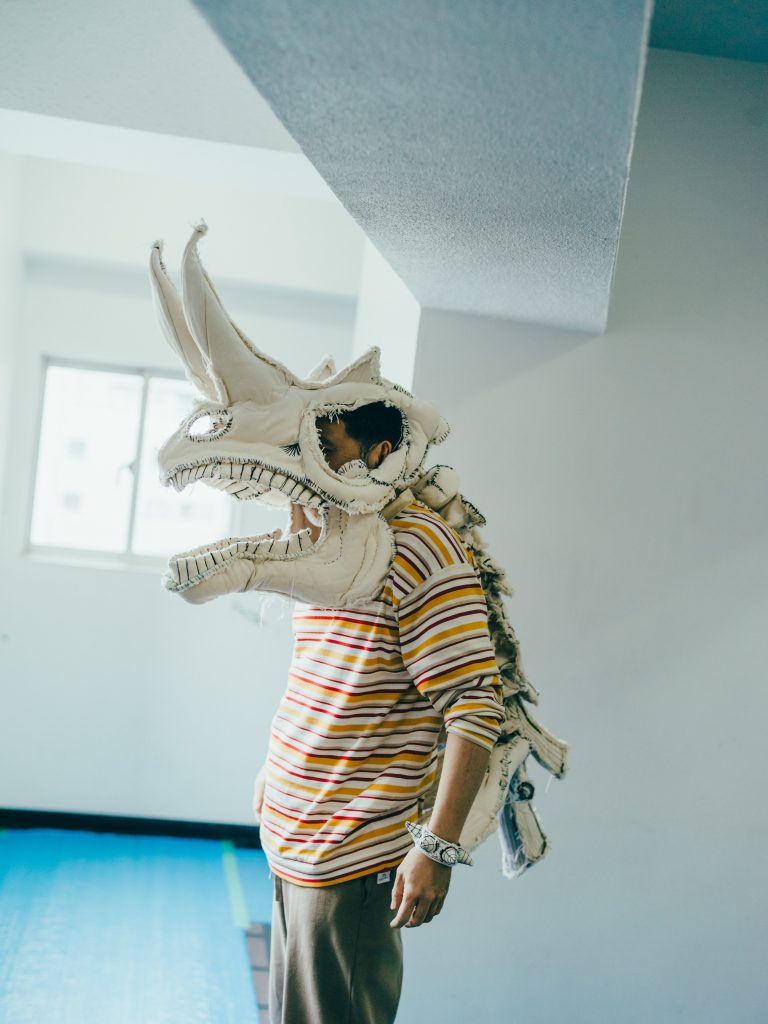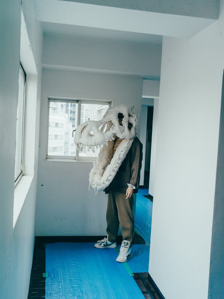 - そうですね。恐竜博から家に帰って、絵を描くためのキャンバス生地を丸めて角とかつくっていたら楽しくなっちゃって。自分の頭にあてながらつくっていると、仮面みたいにかぶれるものができたんです。かぶったら平面にはない興奮があって、原始的で動物的で、なんというか、強くなったような不思議な気分。その日から”自分がかぶる”という馬鹿馬鹿しいコンセプトでひたすらつくり続けました。