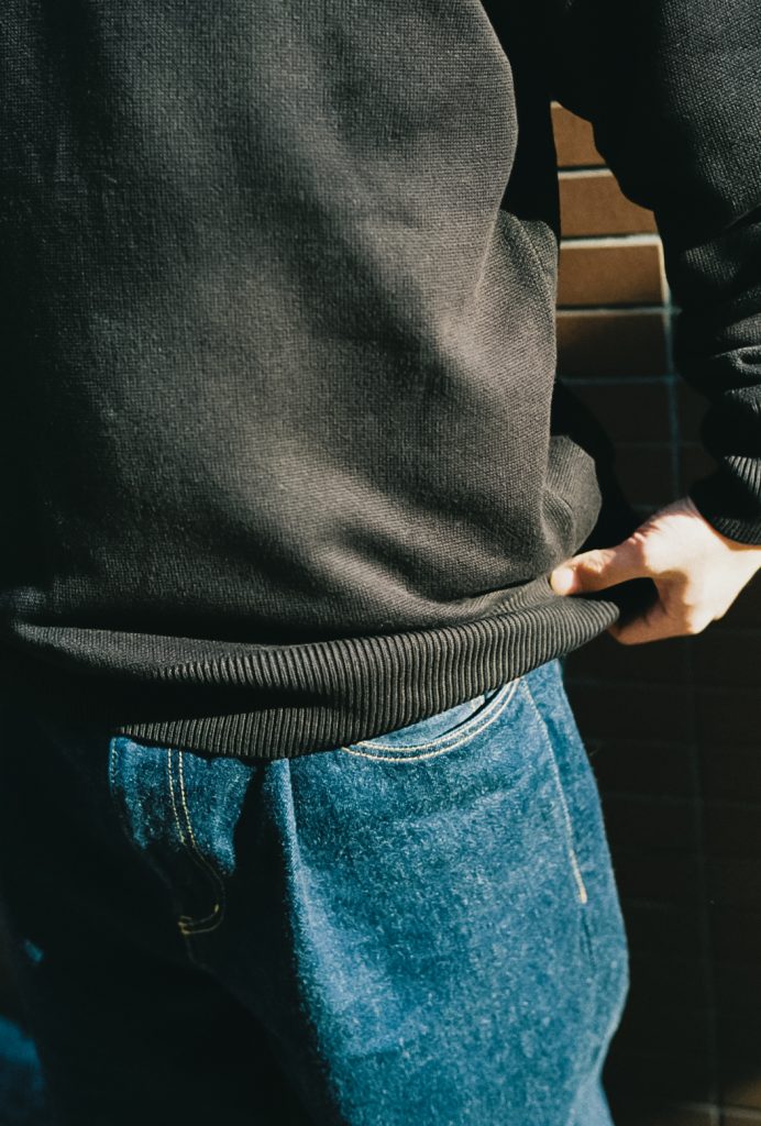 ベーシックな「スウェットトレーナー」のようなデザインで、カットソーの製法ではなくニッティングによって編み上げました。ボディから袖口、裾リブまでが一繋がりの糸からつくられているため上品かつ一体感のある印象に。 身巾や袖巾をゆったりと取った、リラックスした気分の一枚です。